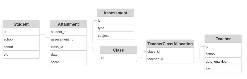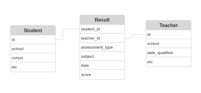 We make one simplification to the data model: a result only links to a teacher if the result is for a class that was taught by a single teacher. This matches how the data was used in the TIDE pilot study, but we may need to revisit this if researchers are interested in classes taught by multiple teachers.